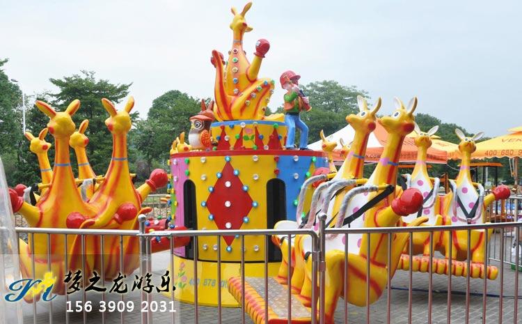 游樂設備袋鼠跳是通過澳洲袋鼠的形象及運動形式設計的,它造型生動形象,設備啟動時,袋鼠上下跳動,圍繞中心旋轉,游客就仿佛乘坐袋鼠在奔跑在遼闊的草原一樣,既能體驗刺激又能開闊視野,十分有趣。
